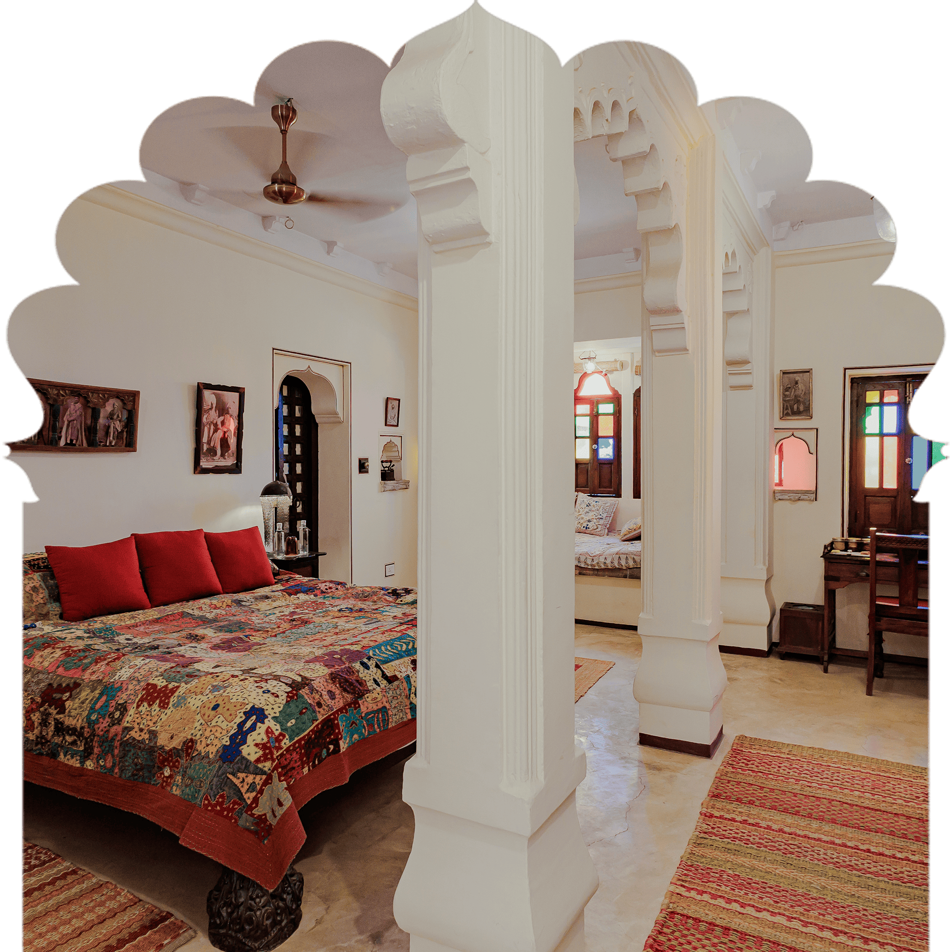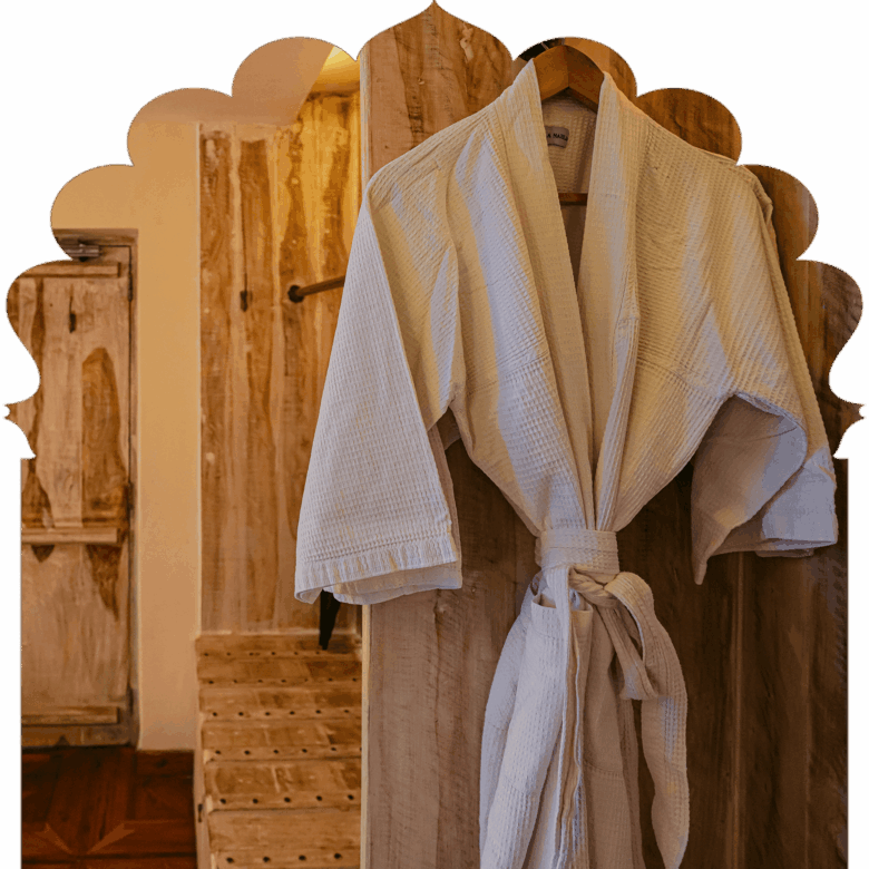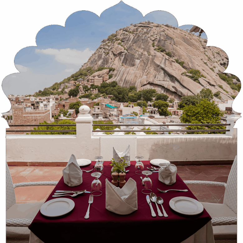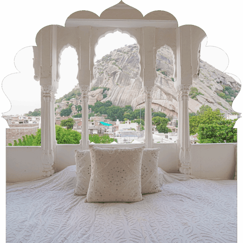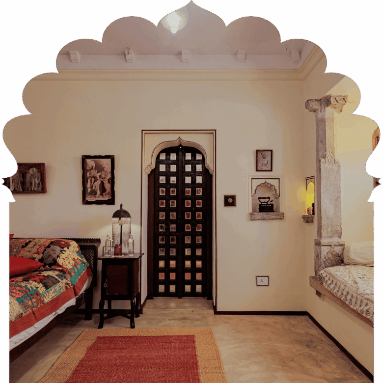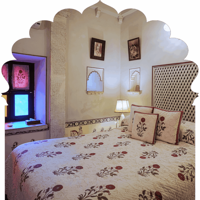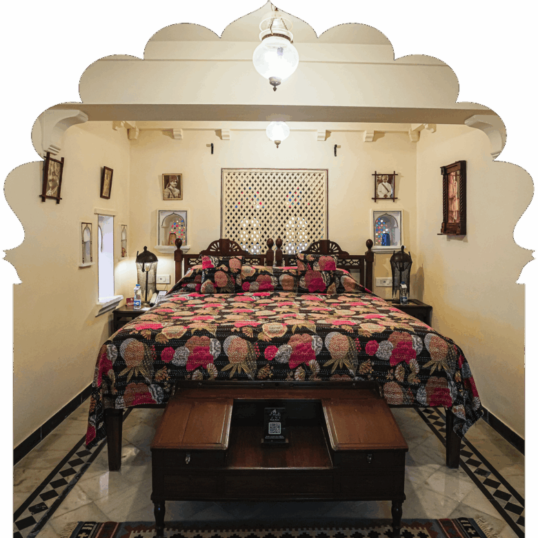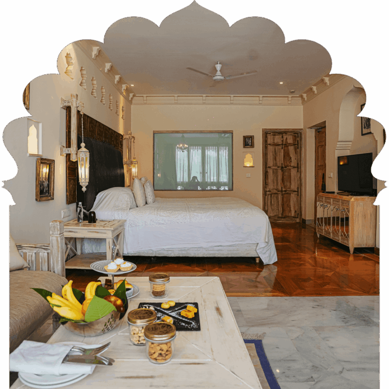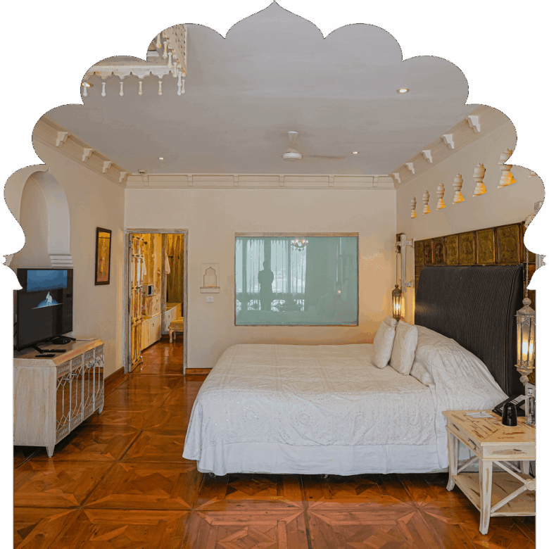 Ideal for those looking for complete privacy and seclusion, and a sumptuous Rajputana regal experience. A private balcony offers stunning glimpses of the medieval village, Elephant Hill, and the placid pool.
