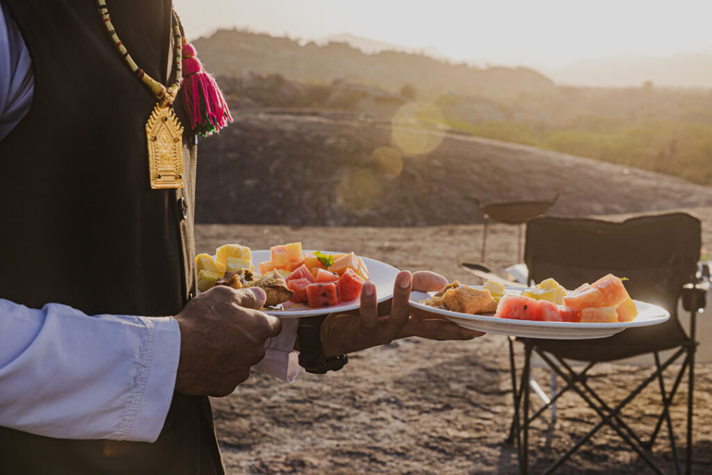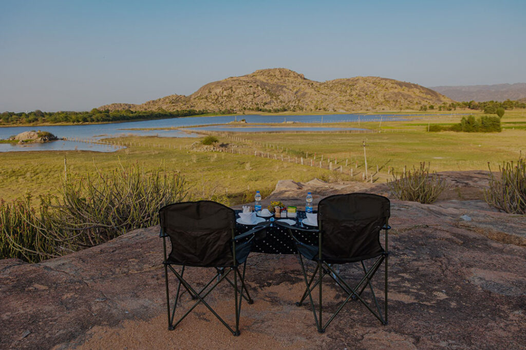 Perched on a hillock, experience blissful tranquility as you view the surrounding 850-million-year-old granite rock formations, kopjes and the rich bio-diversity of this region. With your breakfast spread out on a jeep hood, enjoy a cup of coffee or tea with home-made cookies, freshly baked muffins and sumptuous sandwiches.