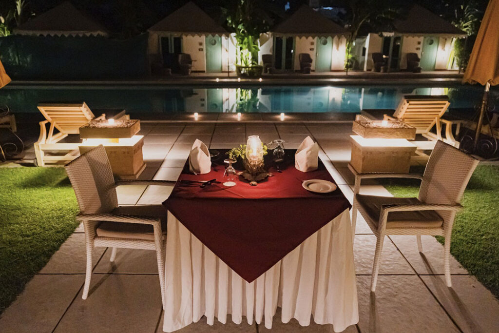 Ensconced within an enclosed lawn, under the shimmering skies, and flanked by our swimming pool, savor an exclusive 4-course menu, which can be personalized to suit your palette. Experience complete privacy, seclusion, exemplary service and a brilliant gastronomic experience in this splendid setting within our property.